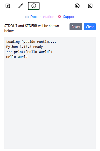 Output fromprint() and errors appear in the Info tab (ℹ️) of the taskpane. Note that output only appears after the function finishes executing.