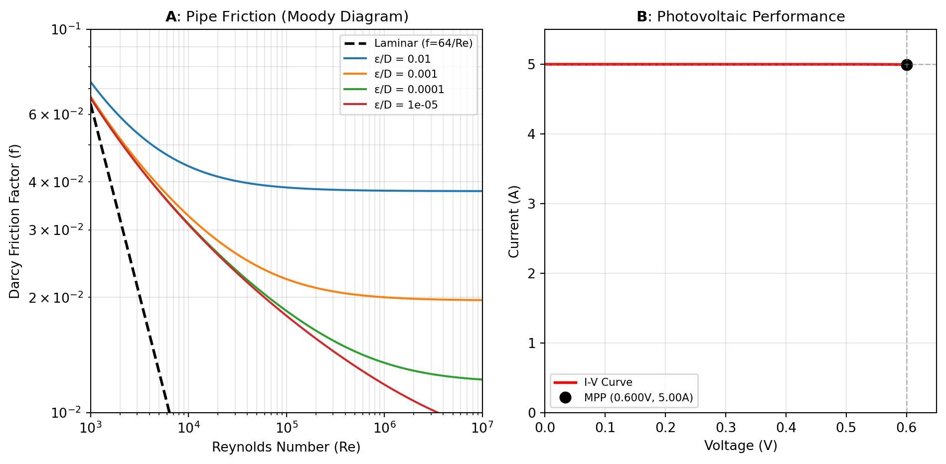 Figure 1: Representative engineering calculations: (A) Moody diagram showing Darcy friction factor versus Reynolds number for various pipe roughness ratios, with distinct laminar (f=64/Re) and turbulent regimes. (B) Photovoltaic I-V characteristic curve illustrating current-voltage relationship and maximum power point for solar cell performance analysis.