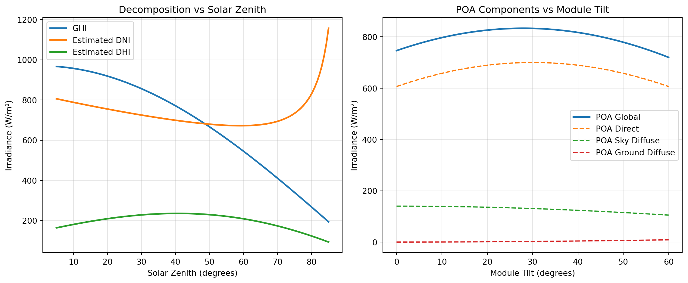 Figure 1: Irradiance modeling concepts: (left) decomposition of GHI into DNI and DHI across solar zenith; (right) POA global irradiance versus module tilt showing beam and diffuse tradeoffs.