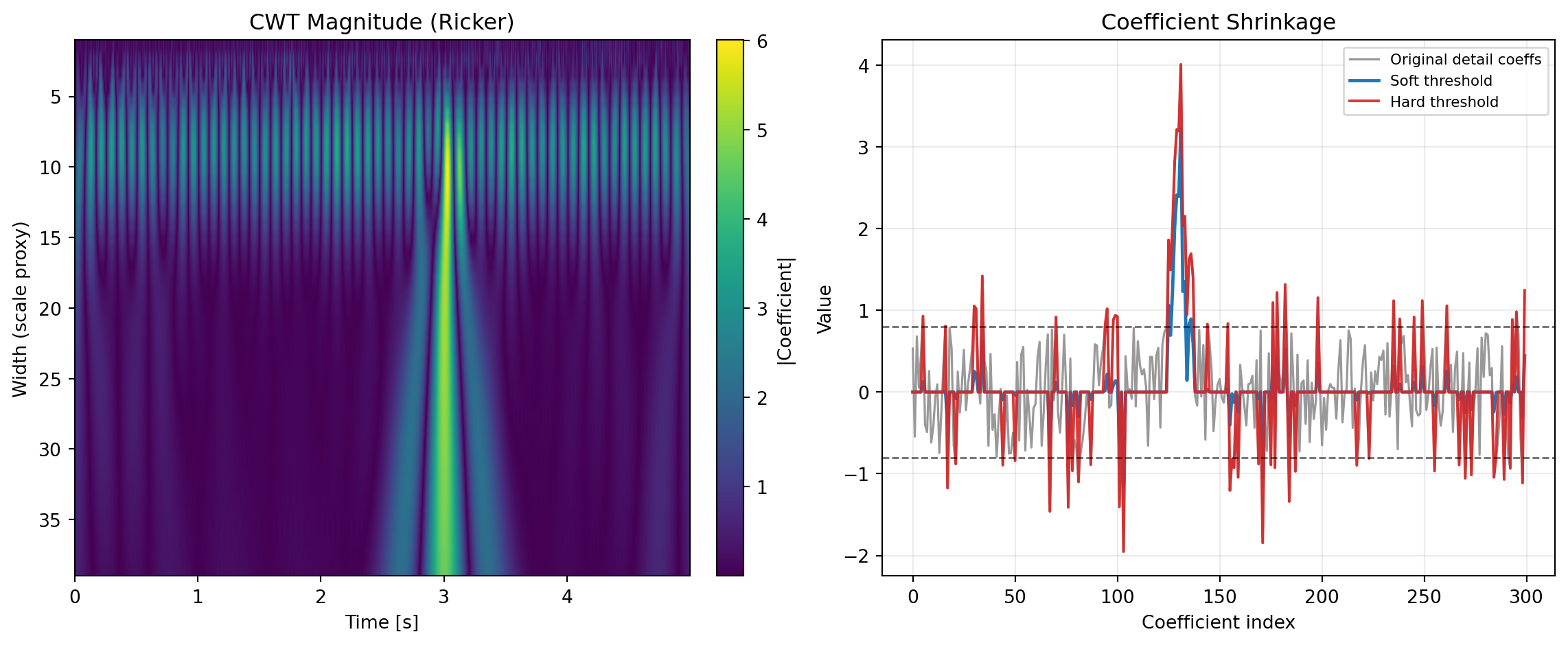 wavelet_type="ricker"and a width range that spans expected event durations. - Inspect coefficient rows for concentrated bursts at specific times and scales.