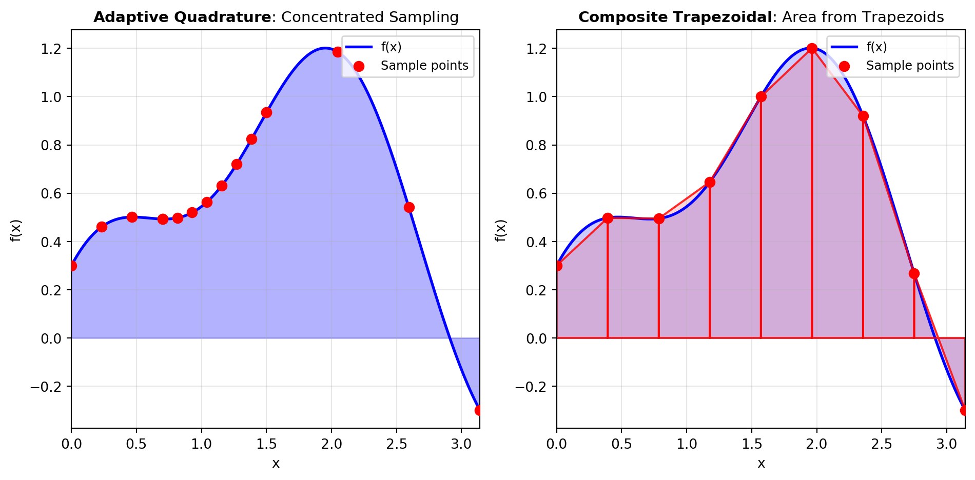 The choice of integration method depends on several factors: the smoothness of the integrand (smooth functions favor polynomial-based methods; oscillatory or singular functions require specialized approaches), the dimensionality of the problem (higher dimensions face the curse of dimensionality), and the form of your data (analytical functions vs. discrete samples). Figure 1 illustrates how adaptive quadrature concentrates samples in regions of curvature and shows the trapezoidal approximation to demonstrate the principle behind composite integration.
