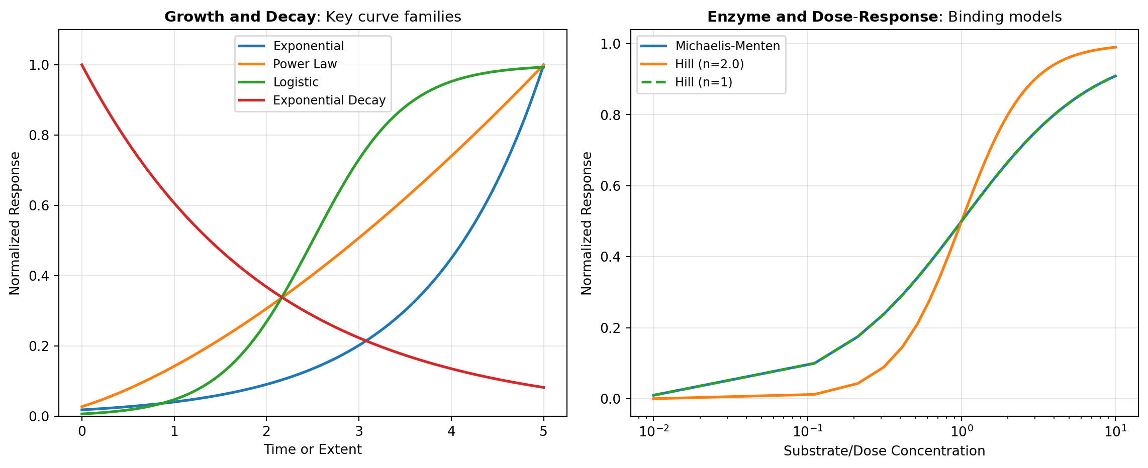 The power of domain-specific modeling lies in leveraging domain knowledge to inform the functional form of your model. Rather than fitting a generic polynomial or spline that might adapt to noise, a model based on underlying physics or chemistry captures the true mechanism generating your data. For example, exponential growth in biology follows predictable patterns that differ fundamentally from logistic (sigmoid) growth, which accounts for resource limitations. Enzyme kinetics follow Michaelis-Menten dynamics, while dose-response curves exhibit sigmoidal behavior characteristic of binding equilibria. By incorporating these domain-specific functional forms, you simultaneously gain better parameter estimates, tighter confidence intervals, and models that extrapolate meaningfully beyond your data range.
