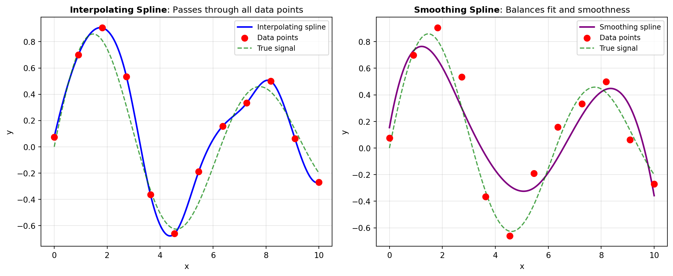 Smoothing splines differ fundamentally from interpolating splines—rather than passing through every data point, they approximate the data while minimizing roughness. Smoothing is essential when your data contains measurement noise or measurement error. The smoothing parameter controls the trade-off between fitting the data closely and maintaining a smooth curve. Two primary implementations are available: SMOOTH_SPLINE for classical smoothing splines and UNIVARIATE_SPLINE for more flexible univariate spline fitting.