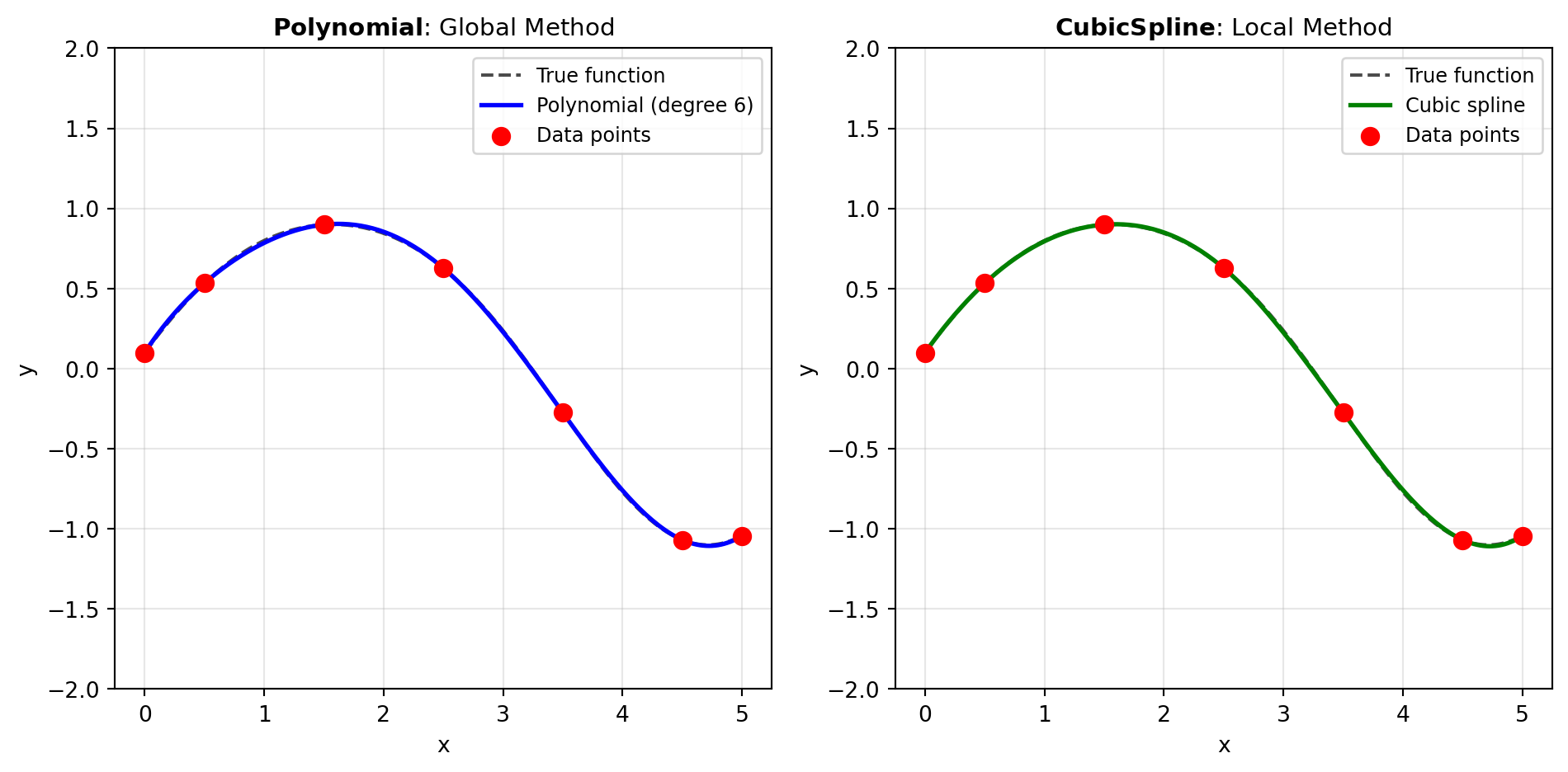 The choice of interpolation method profoundly affects the quality and behavior of the resulting function. Key considerations include the nature of the data, desired smoothness properties, computational efficiency, behavior outside the data range, and whether derivative information is available. Figure 1 illustrates two distinct approaches to univariate interpolation.