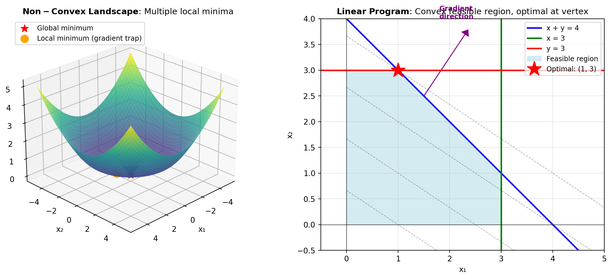 Figure 1: Optimization algorithm landscape: (A) Problem landscape showing local minima (valleys) and global minimum (deepest valley), illustrating why local methods get stuck and global methods are needed. (B) Feasible region for a linear program showing objective function contours and optimal vertex solution.