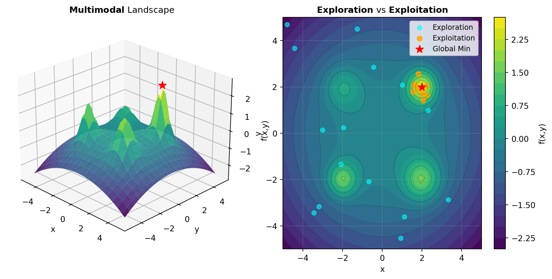Search Space Landscape: Global optimization problems vary dramatically in complexity. The true challenge lies in whether the objective function exhibits convexity (single global optimum), multimodal structure (multiple local optima), or ruggedness (rapid fluctuations, discontinuities). The visualization below illustrates these landscape types and how different algorithms respond to them. Figure 1 shows a smooth multimodal surface alongside a discrete enumeration strategy.