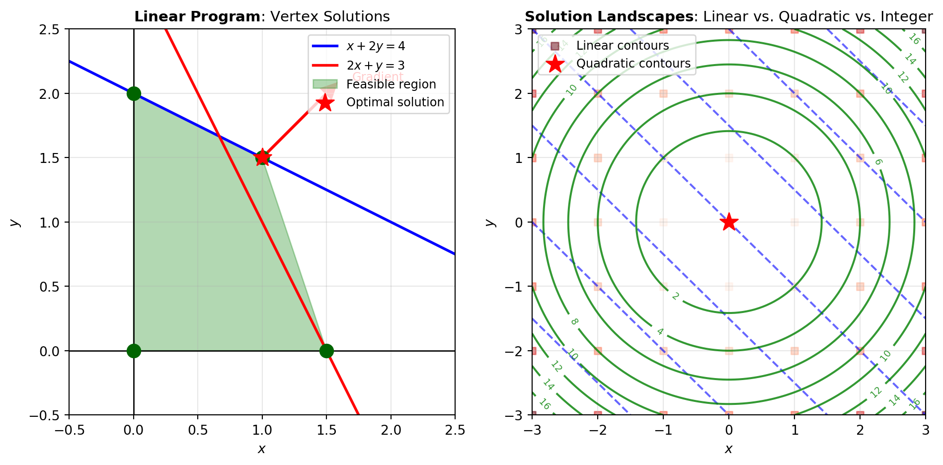 Figure 1 illustrates the geometric intuition behind linear programming and shows how the solution landscape differs between linear, quadratic, and integer programs.