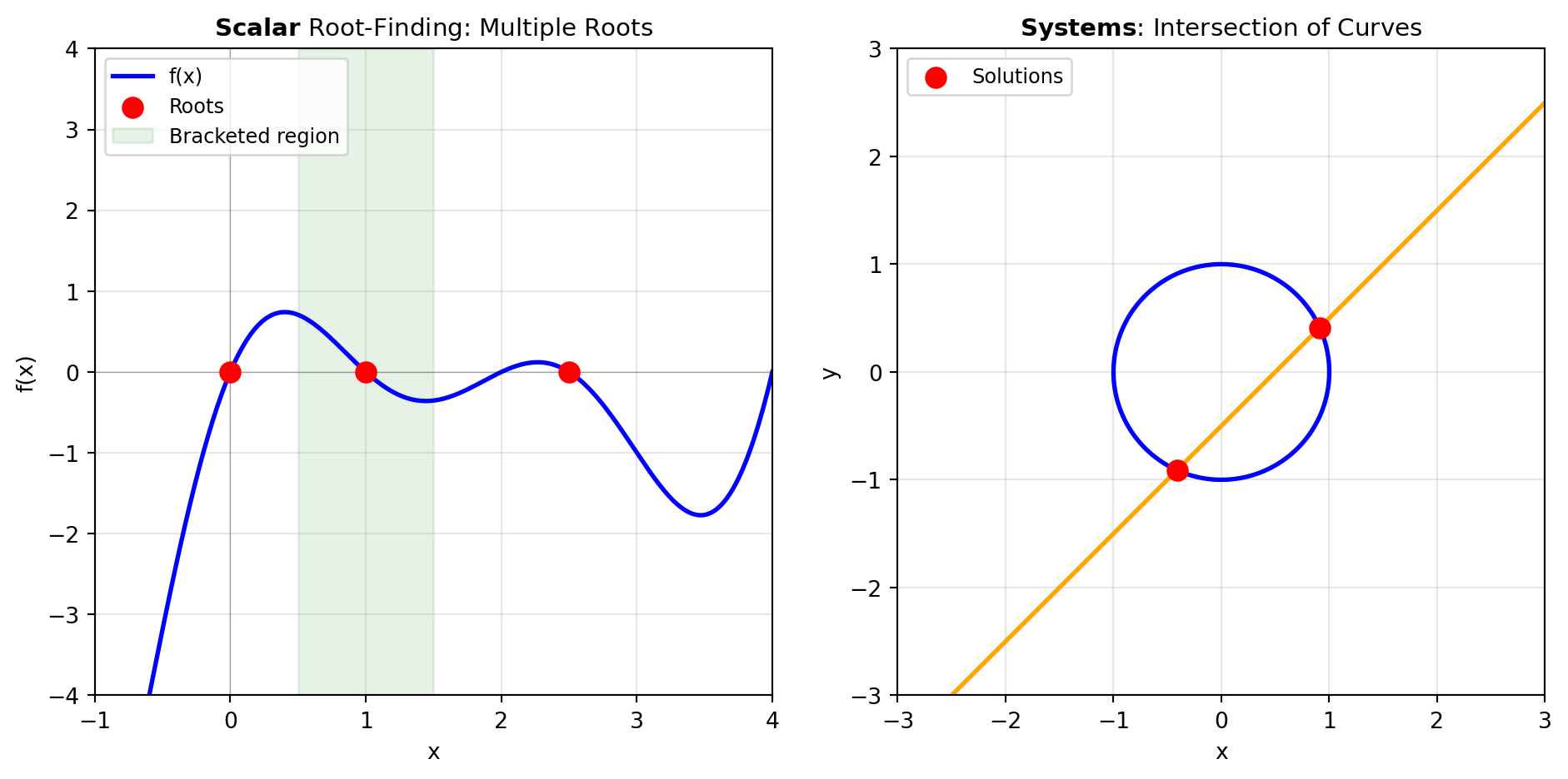 The difficulty of root-finding depends heavily on problem characteristics: whether the function is scalar or multidimensional, smooth or discontinuous, whether derivatives are available, and whether roots are isolated or part of a continuum. Figure 1 illustrates the contrast between different problem classes and demonstrates how algorithm behavior varies with function topology.
