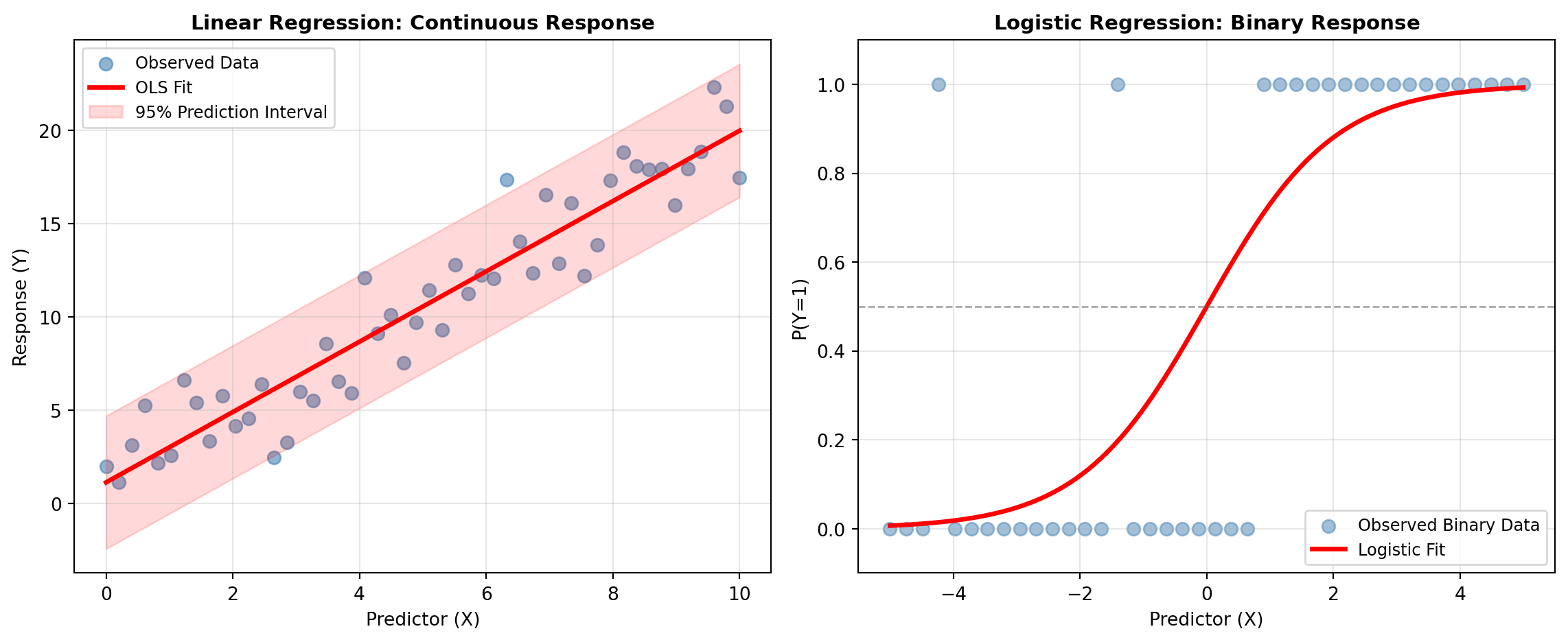 Figure 1: Statistical Model Landscapes: (A) Linear Regression showing OLS fitting a continuous response (Y) to a predictor (X) with prediction intervals. (B) Logistic Regression showing the probability of binary outcomes (0/1) across a range of predictor values, with the characteristic S-shaped sigmoid curve.