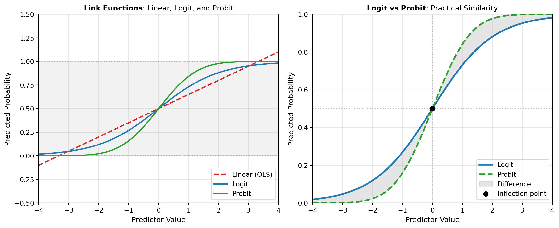 Logistic and Probit Models form the backbone of discrete choice analysis. These models address a critical limitation of ordinary least squares (OLS) regression when applied to binary or categorical outcomes: OLS produces unbounded predictions that can fall outside [0, 1], violates homoscedasticity assumptions, and assigns equal weight to all observations regardless of whether predictions are near 0.5 or extreme. Instead, logistic and probit models use nonlinear link functions that constrain predictions to the [0, 1] interval, making them theoretically sound and statistically efficient.