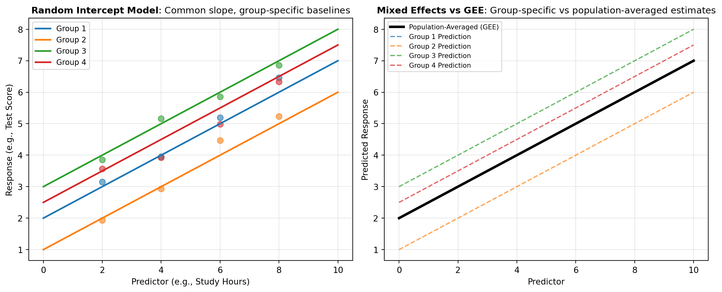 The fundamental problem they solve involves violating the independence assumption in ordinary least squares (OLS) regression. When observations are clustered—such as students nested within schools, patients within hospitals, repeated measures from the same individual, or plots within farms—the errors become correlated. This violates a key assumption of classical regression, leading to biased standard errors, incorrect confidence intervals, and potentially misleading statistical inference. Mixed effects models handle this correlation structure by allowing intercepts and slopes to vary across groups.
