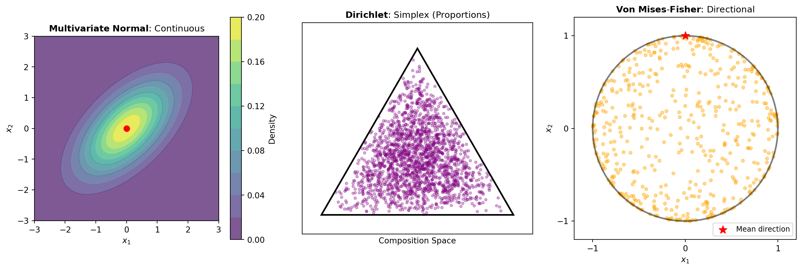 Figure 1 illustrates key distinctions across these distribution families: the normal model capturing continuous multivariate relationships, the simplex-constrained Dirichlet handling compositional data, and the von Mises-Fisher directing observations on the sphere.