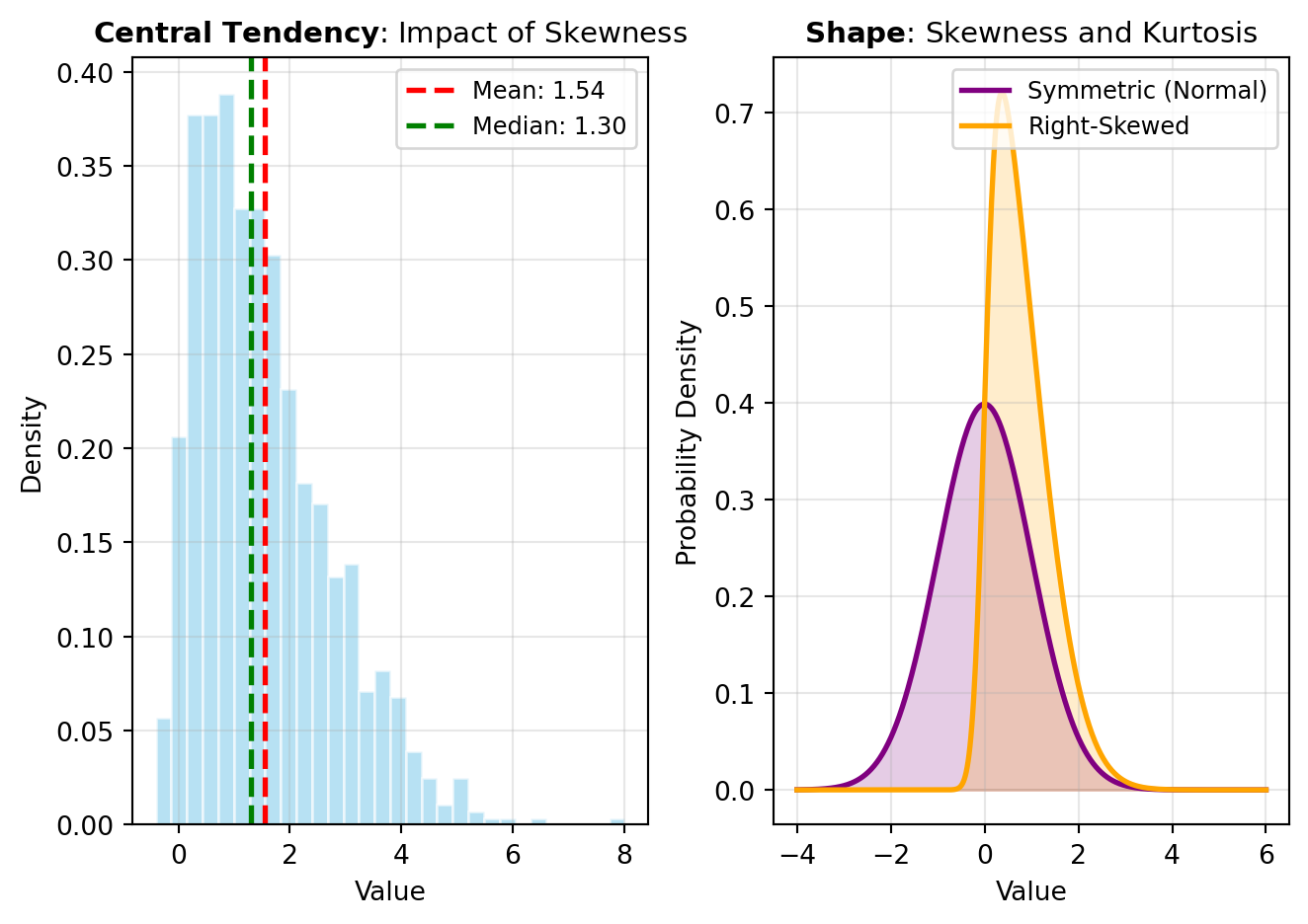 Shape describes the distribution’s symmetry and peakedness. Skewness measures asymmetry: positive skew indicates a long tail extending right, while negative skew shows a tail extending left. Symmetric distributions have skewness near zero. Kurtosis measures the distribution’s tailedness—how peaked or flat it appears compared to a normal distribution. High kurtosis suggests heavy tails with extreme values; low kurtosis indicates lighter tails. These shape metrics reveal important distributional properties that central tendency and dispersion alone cannot capture.