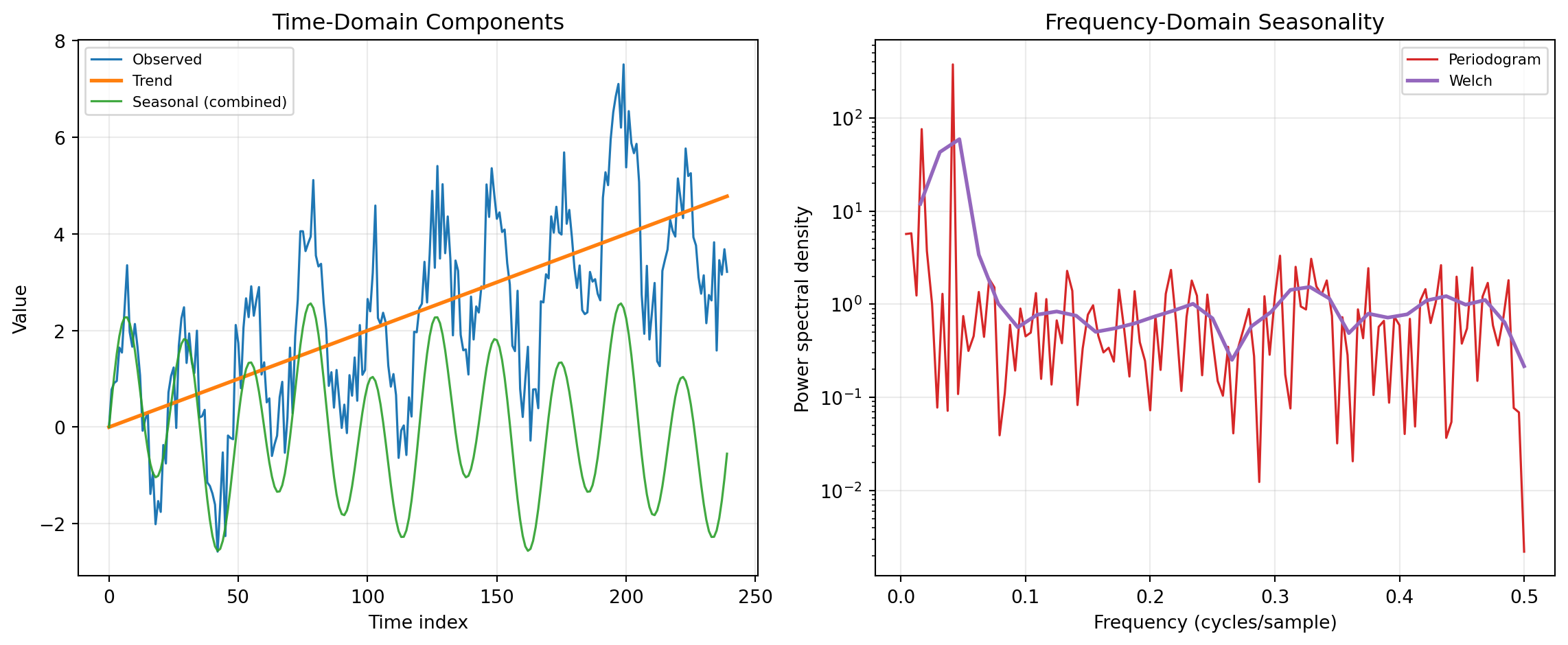Figure 1: Decomposition and seasonality concepts: (left) observed series with trend and seasonal components; (right) power spectral density estimates using periodogram and Welch methods.